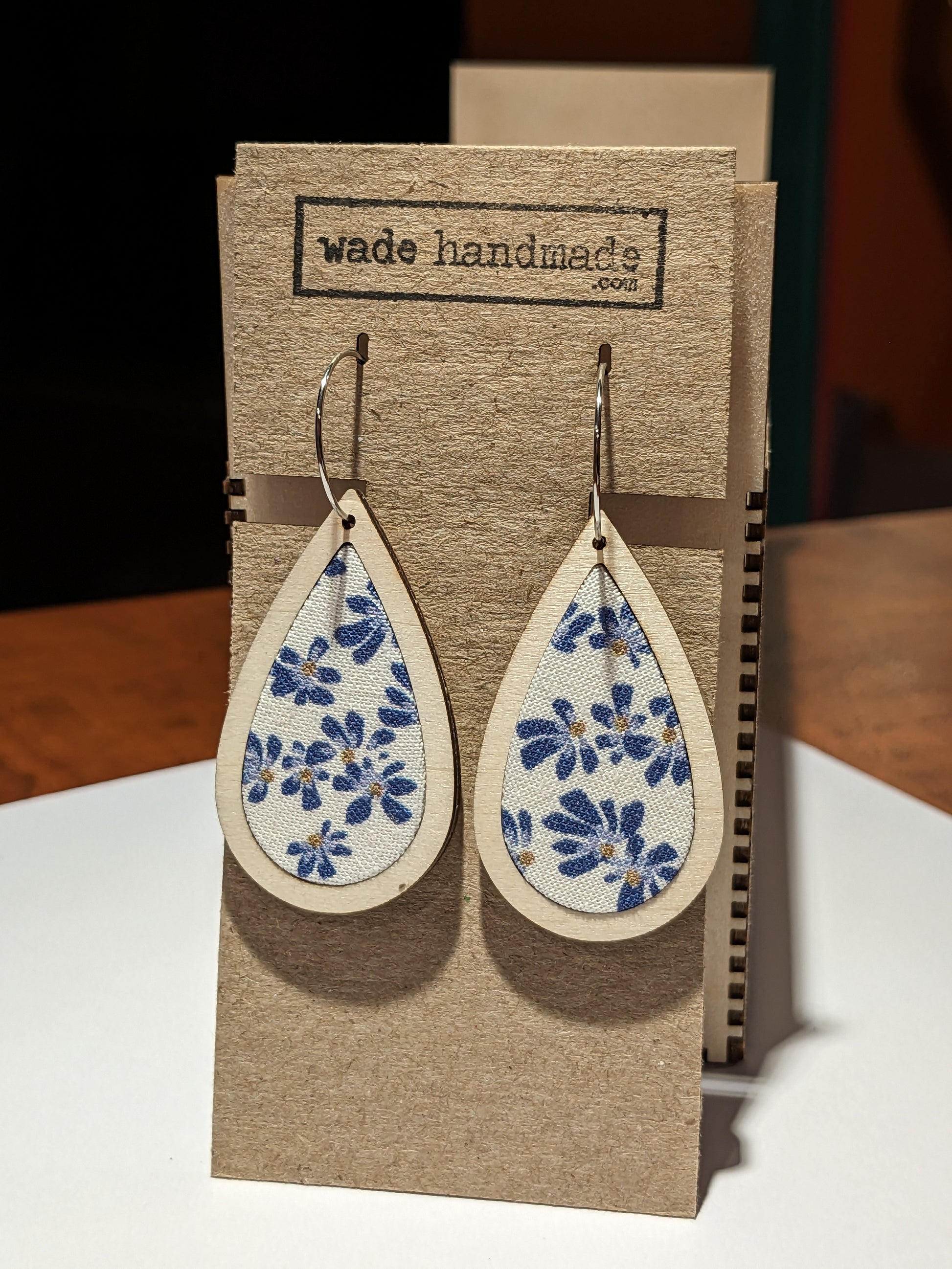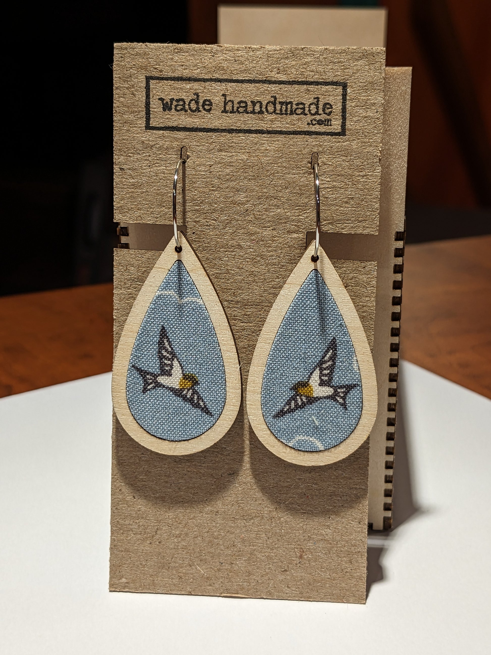 These handmade earrings are made from fabric and wood, and are extremely lightweight. Solid wood backing. Lightly sealed, please remove before showering.
